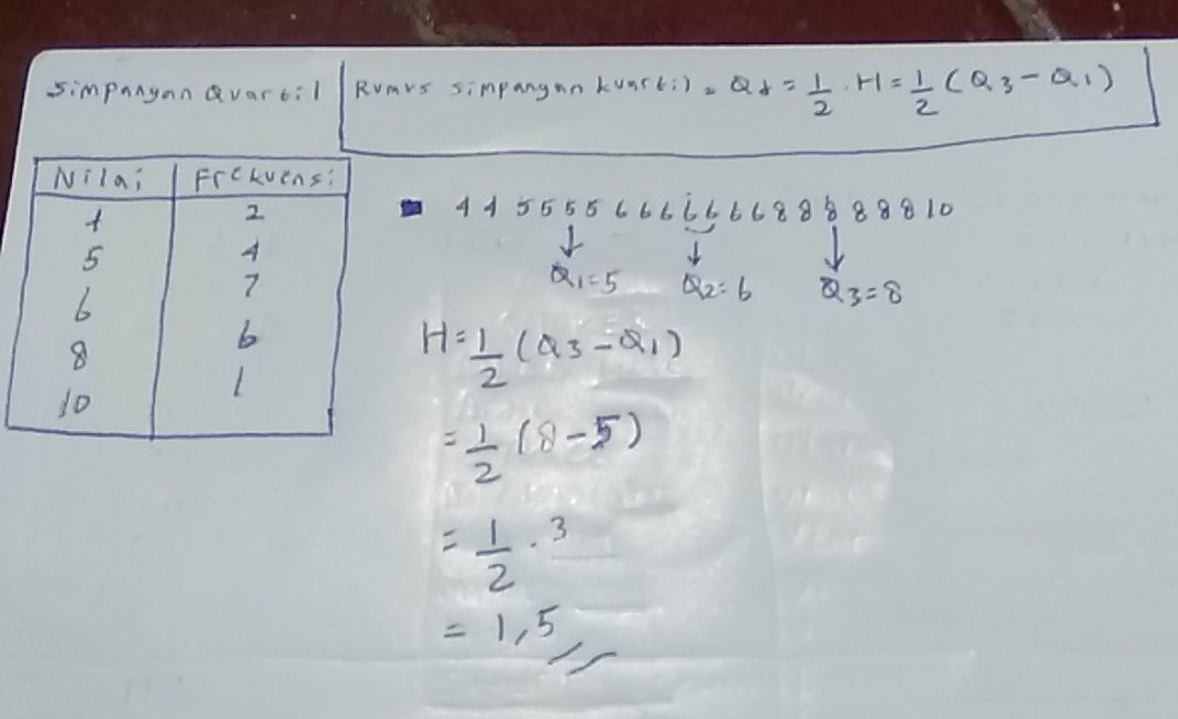 Dan dalam suatu data pada kuartil dibedakan menjadi 3 . Dari tabel diatas dapat dicari kuartil yaitu. Lalu fq3 adalah frekuensi dari data itu tersendiri. Untuk dapat menentukan simpangan kuartil/jangkauan interkuartil pada sebuah data. Simpangan kuartil (qd) dari data pada tabel di bawah ini adalah.